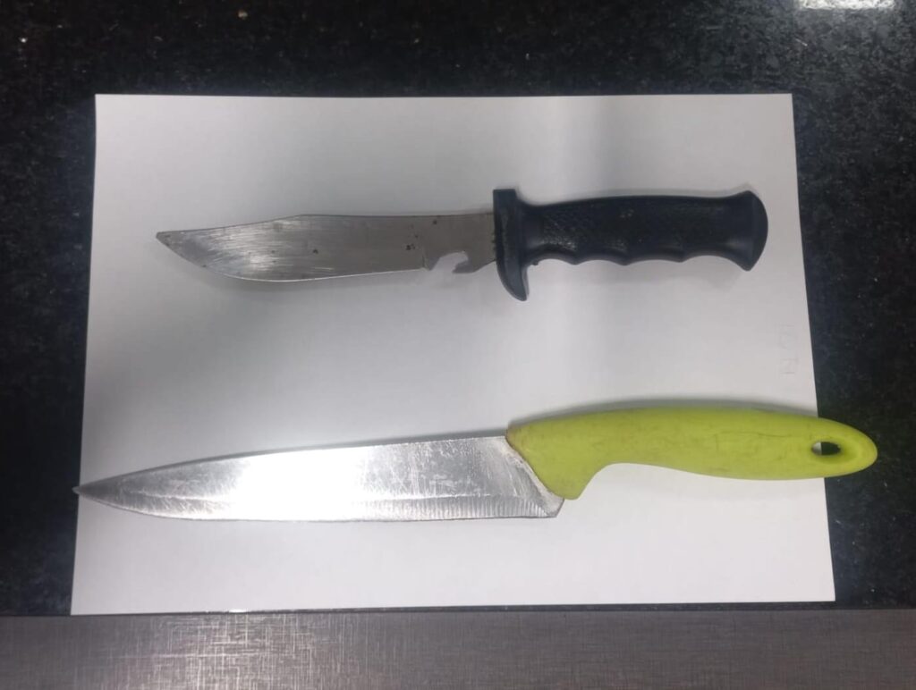 Com eles, foram apreendidas duas facas, uma com lâmina de 18 cm e outra de 15 cm. O preso possui extensa ficha criminal, incluindo tráfico de drogas, furtos e desobediência, enquanto o adolescente já tem passagens por tráfico.