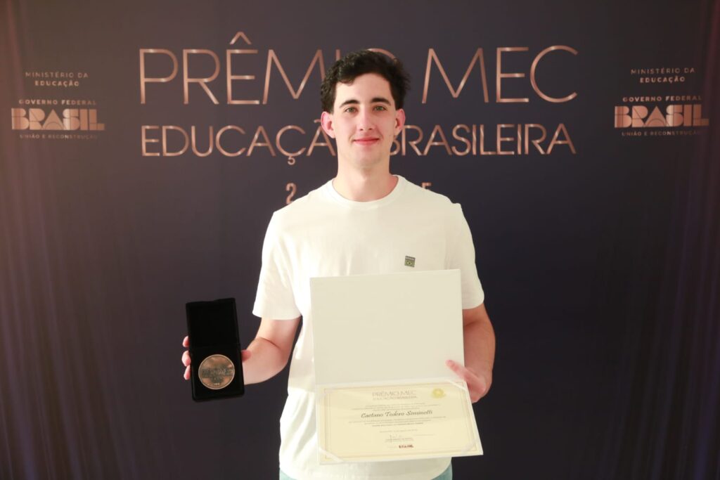 Na última segunda-feira, 11 de agosto, Dia do Estudante, o Ministério da Educação (MEC) realizou a cerimônia de entrega do primeiro Prêmio MEC da Educação Brasileira para 116 premiados, das redes públicas de ensino estaduais e municipais, escolas e estudantes de todo o país. Entre os agraciados no palco do evento, realizado no Palácio do Planalto, em Brasília (DF), estava o estudante egresso do Campus Osório, formado em 2024 no curso Técnico em Informática Integrado ao Ensino Médio, Caetano Todero Seminotti. Ele foi destaque na categoria Exame Nacional do Ensino Médio (ENEM), que é direcionada ao alto desempenho na redação.