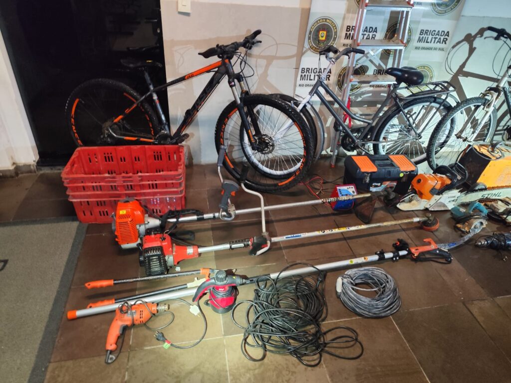 Na sequência, o homem apontado como receptador foi abordado e preso. A ação resultou na apreensão de três bicicletas, duas esmerilhadeiras, três furadeiras, uma serra circular, uma broca diamantada, uma caixa de ferramentas, uma serra de poda, duas roçadeiras, uma motosserra e uma escada de alumínio.