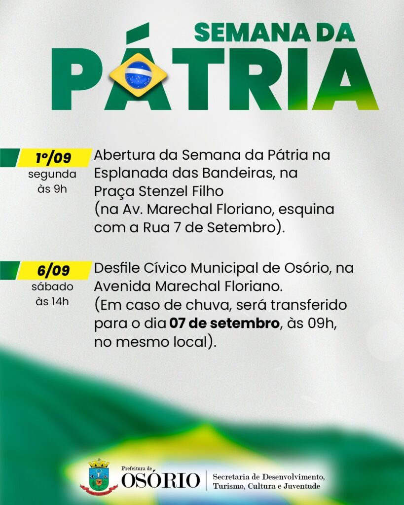 Na próxima segunda-feira (1º/09), às 9h, na Esplanada das Bandeiras (Praça Antônio Stenzel Filho), centro de Osório, ocorre a abertura oficial da Semana da Pátria no município. Toda a comunidade está convidada a participar da solenidade que ainda vai homenagear entidades do evento neste ano.