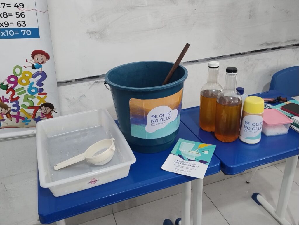 A oficina do programa De Olho no Óleo ocorreu na quarta-feira (22/10), na sala de aula do 4º ano, onde a especialista em Responsabilidade Social da Corsan Cristiane Medeiros ensinou a turma que é possível produzir sabão neutro reciclando o óleo de cozinha usado. Ela também enfatizou a importância de descartar corretamente o óleo, que pode ser levado para os locais de coleta ou reaproveitado na produção do sabão ecológico. O produto pode ser usado em casa ou vendido como opção de renda extra.
