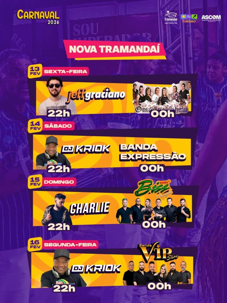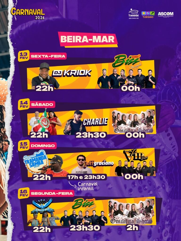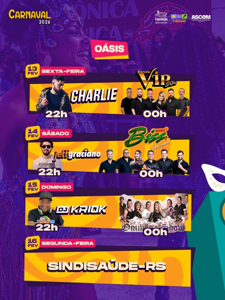 Prepare o confete, a fantasia e a alegria, porque Tramandaí já está em clima de festa! A Prefeitura de Tramandaí, por meio da Secretaria de Turismo, apresenta a Programação Oficial do Carnaval 2026, com quatro dias de muita música, samba, alegria e diversão para toda a família, em diferentes pontos da cidade.