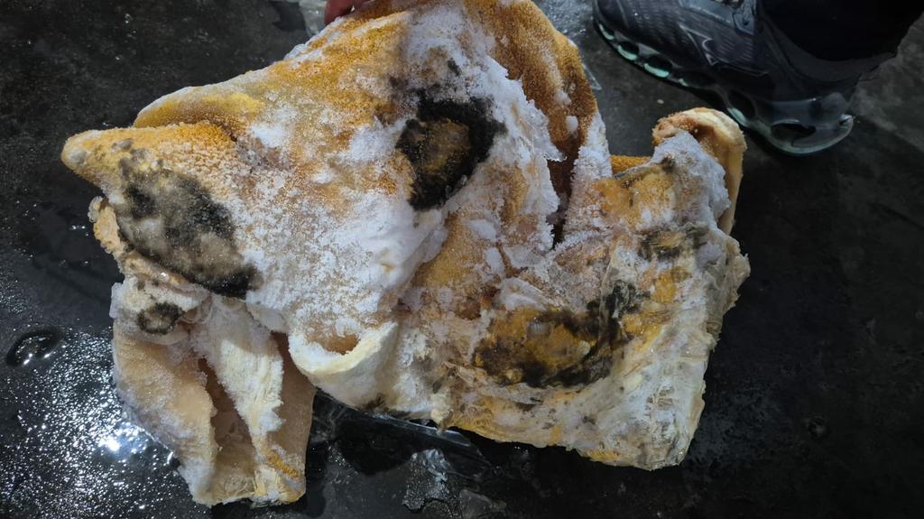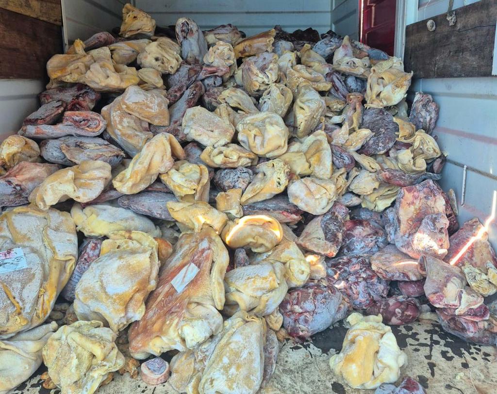 Nos contêineres e áreas internas do supermercado foram identificados produtos de origem animal em condições completamente inadequadas para o consumo humano, incluindo carnes bovina, suína, ovina, de frango, miúdos de frango e bovinos, bacon, hambúrgueres e diversos tipos de pescados. As equipes encontraram toneladas de itens vencidos, sem procedência, mal acondicionados, com embalagens primárias abertas ou preservados em temperaturas incompatíveis com as indicadas pelo fabricante. Muitos dos produtos apresentavam aspecto, cor e odor repugnantes, forte indicativo de deterioração ou contaminação. Também foram identificadas caixas plásticas totalmente sujas, mau estado de conservação dos equipamentos e forte odor de esgoto na área externa onde estavam instalados os contêineres.