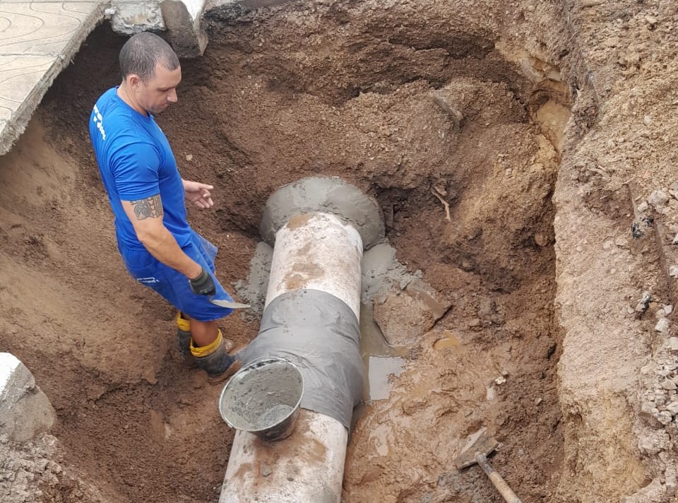 Equipe da Secretaria de Obras e Saneamento realiza o conserto de tubulações de esgoto cloacal e pluvial em Osório
